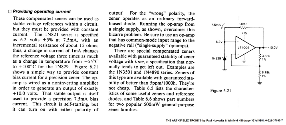 For some time now I have been checking Amazon to see if the 3rd edition of The Art of Electronics has been published yet. And today I found that a new edition should hit the stores in April...WOW!! This is an amazing book and it should be on the shelf in any electronics lab. It has the right amount of theory and has a lot of design ideas which are well explained. Get it if you are not already an owner! After I saw the good news I grabbed my 2nd edition and started flipping through it as I have done so many times. This time I stumbled upon another reference voltage source. See the picture below.