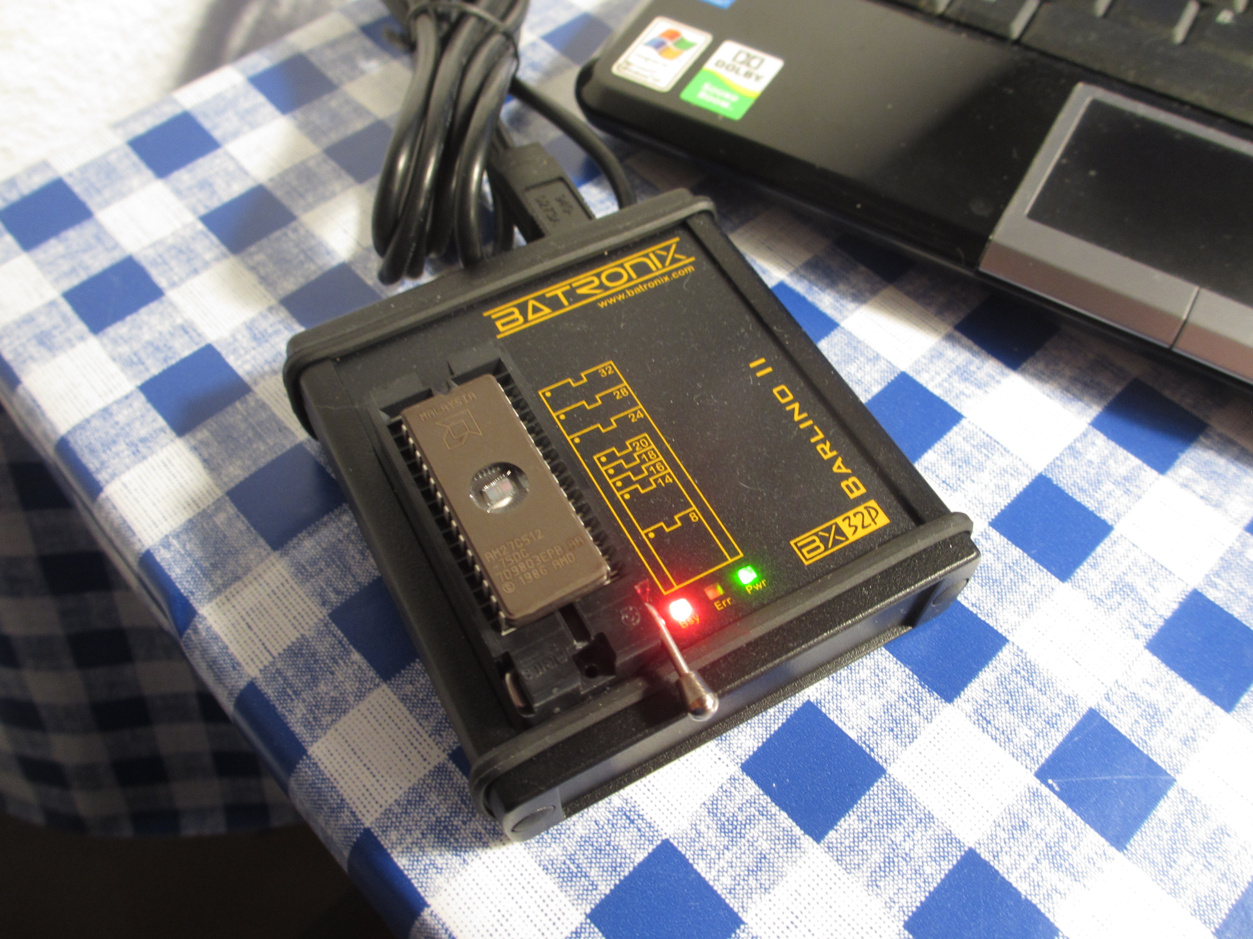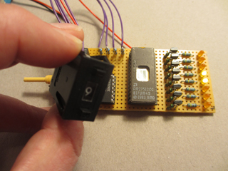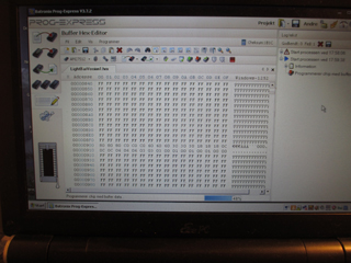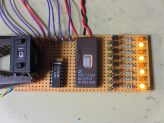 The final code can be found here. On the first page the actual code is found and on the following pages the patterns I selected are seen. The circuit is very simple. I used a 27C512 for the final design because I have a lot of those around. A short description...well the EPROM holds the program and the output of the EPROM is connected to the LEDs. If you want to use a big light bar on top of your car these outputs can be buffered so it can drive high power LEDs. The light patterns are programmed into the lower end addresses (A0-A4) and the upper end A8-A11 are used to select a pattern. U2 is a binary counter which just counts until it reaches Q6 and resets the counter. To generate a clock for this counter I used the simple 4093 oscillator and the spare NAND gates have been grounded so they don't make any trouble. Since the EPROM runs on 5V a small regulator (U4) has been added. A short video of the light patterns can be found here. And below are some pictures of the complete circuit. I have been watching some more videos and have made some new patterns. Here you can see the new patterns. And maybe I will build some kind of bar with some high power LEDs...maybe.